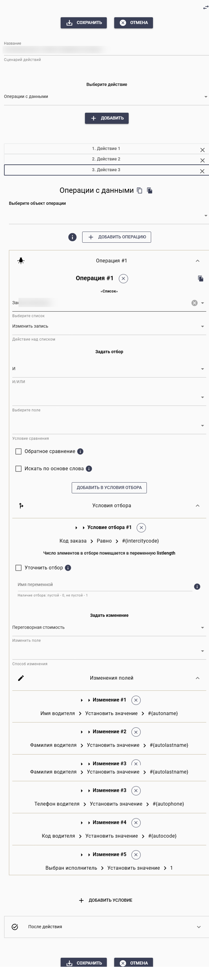 Для присвоения в Список, необходимо выбрать список и одну из операций: "Добавить новую запись", "Изменить запись", "Удалить запись". Для добавления новой строки в список заполните список полей списка новыми значениями. Для изменения и удаления записи, сначала необходимо указать условия для отбора. Для условия сначала выбираете поле из списка, затем условие сравнения (Равно, Не равно, Содержит, Не содержит, Больше, Больше либо равно, Меньше, Меньше либо равно). Далее в строке сравнения указать значение (значение, переменную, шаблон замен, функцию). Настройка "Обратное сравнение" будет искать строку сравнения не в полях списка, а наоборот, поля списка в строке сравнения. Далее можно уточнить отбор, указав, сколько строк нам понадобятся. Также можно указать имя переменной для результата отбора, которая принимает 1, если отбор не пустой и 0, если отбор пустой. Далее нужно добавить изменяемые поля. В качестве операции с полями можно выбрать "Установить значение", "Добавить значение", "Удалить значение". "Добавить значение" превращает ячейку в массив, который будет записан в виде строки.