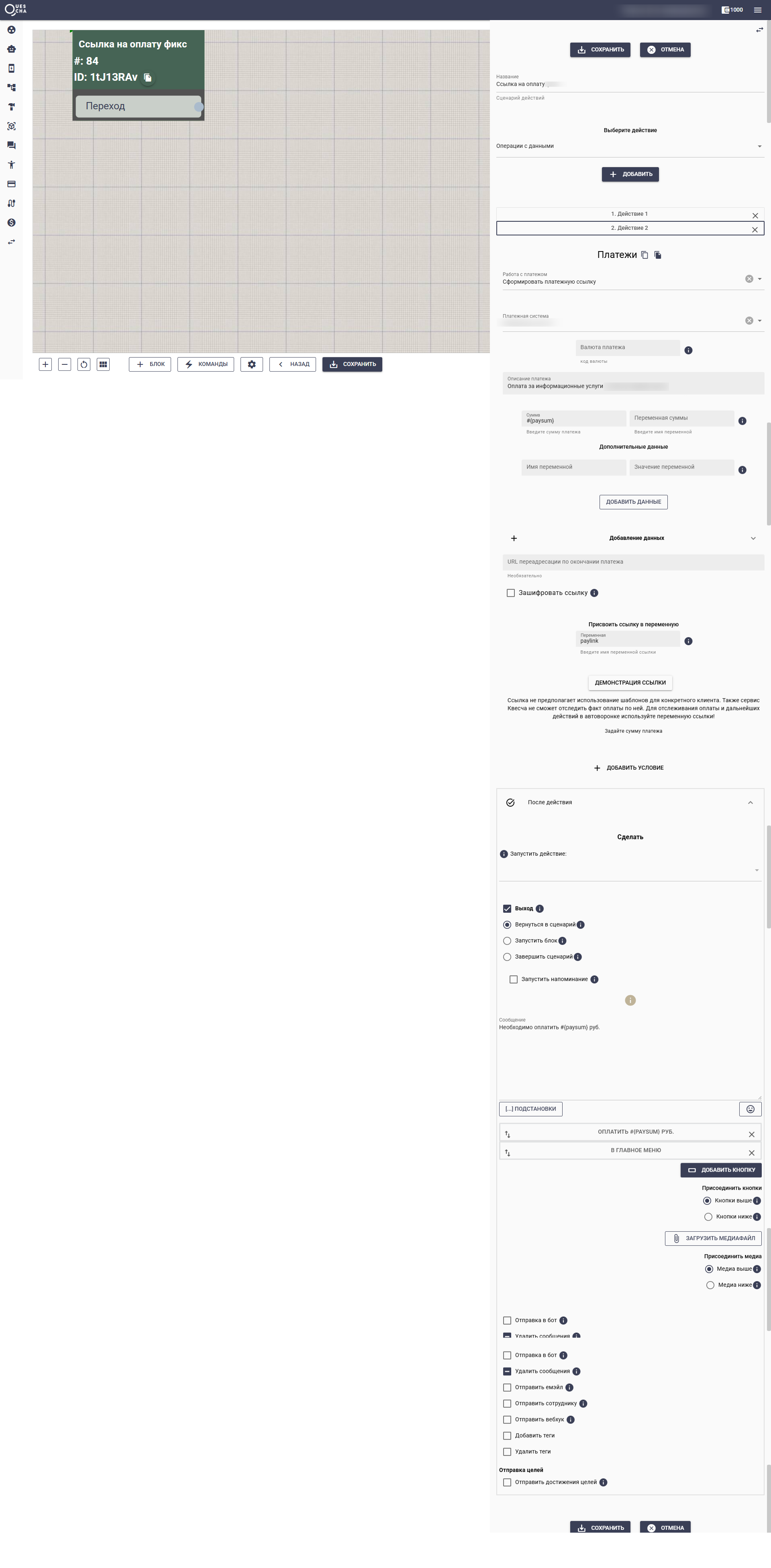 В области "После действия" верните платежную ссылку в кнопке или тексте сообщения.