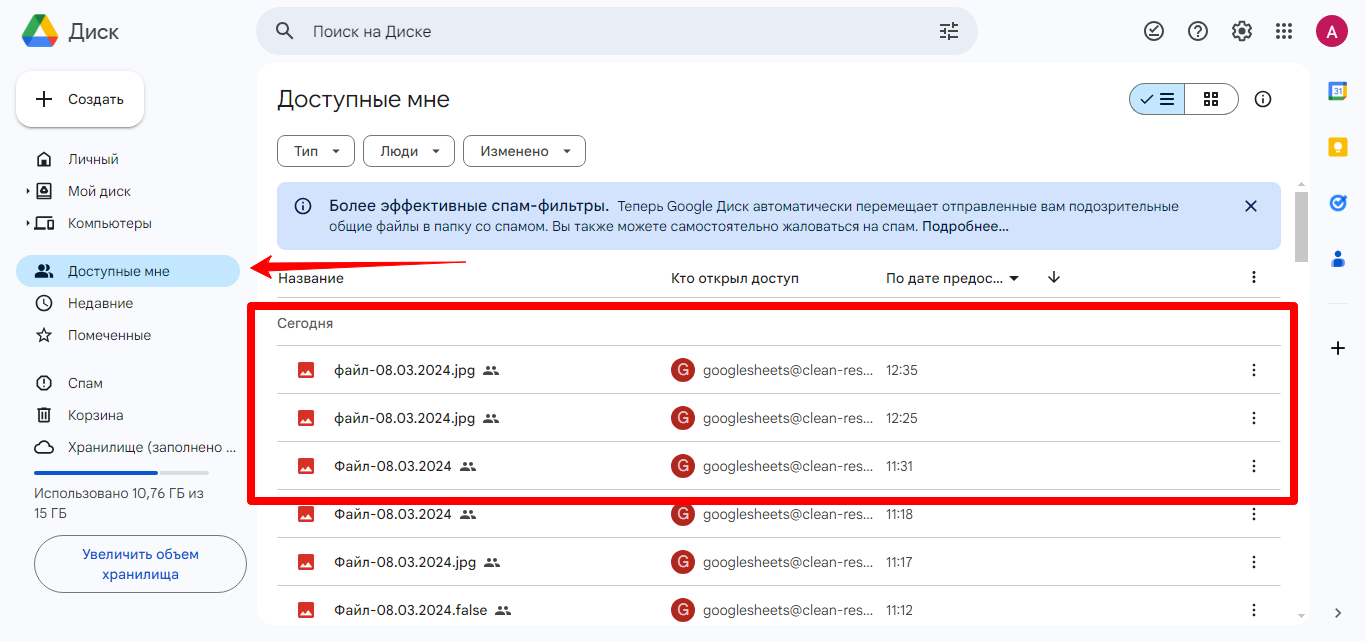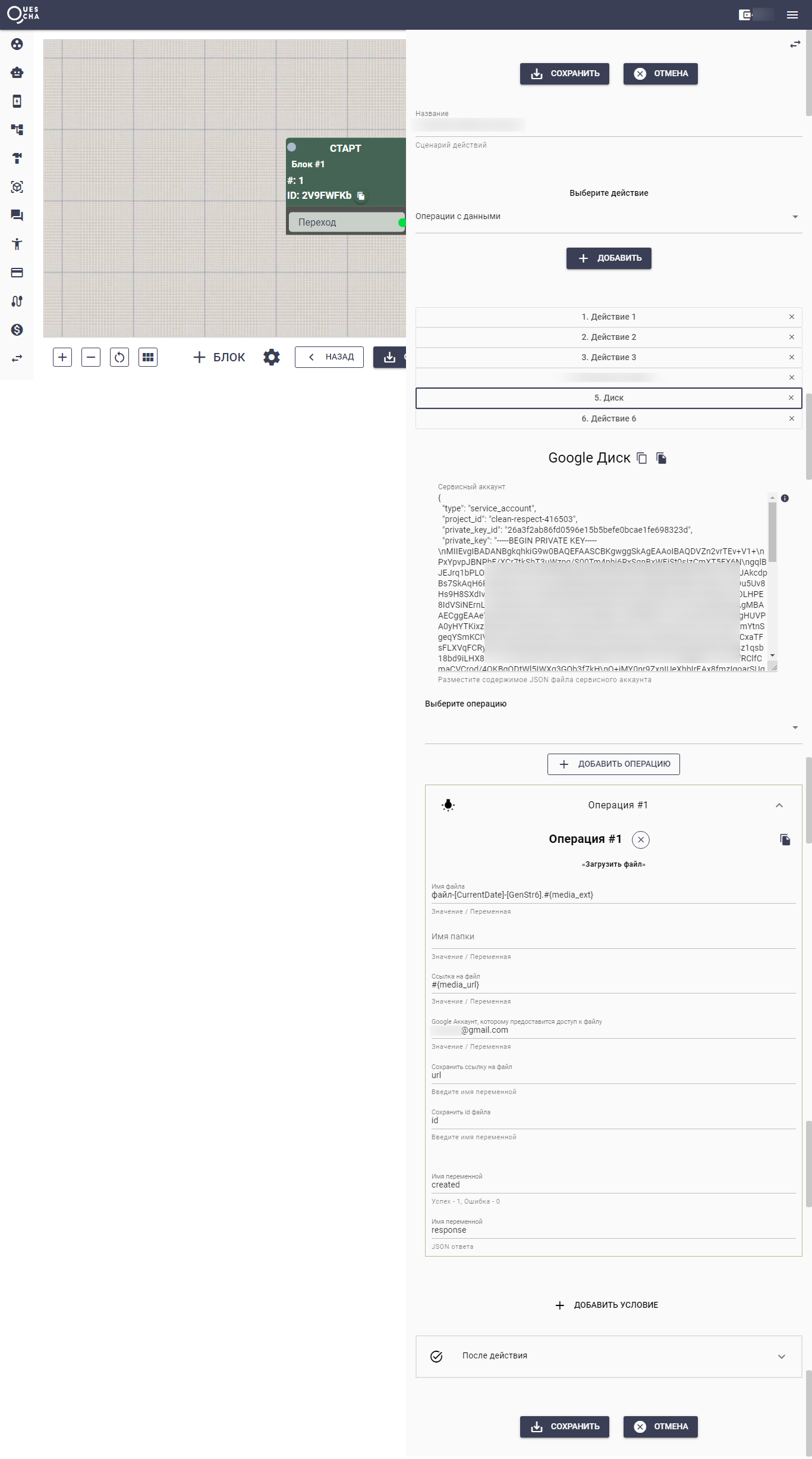 Обратите внимание, что на скриншоте отображен сервисный аккаунт, который для Гугл Диска больше не используется. Вместо сервисного аккаунта, необходимо добавить Гугл Аккаунт на странице интеграций https://app.quescha.com/autofunnels/integrations