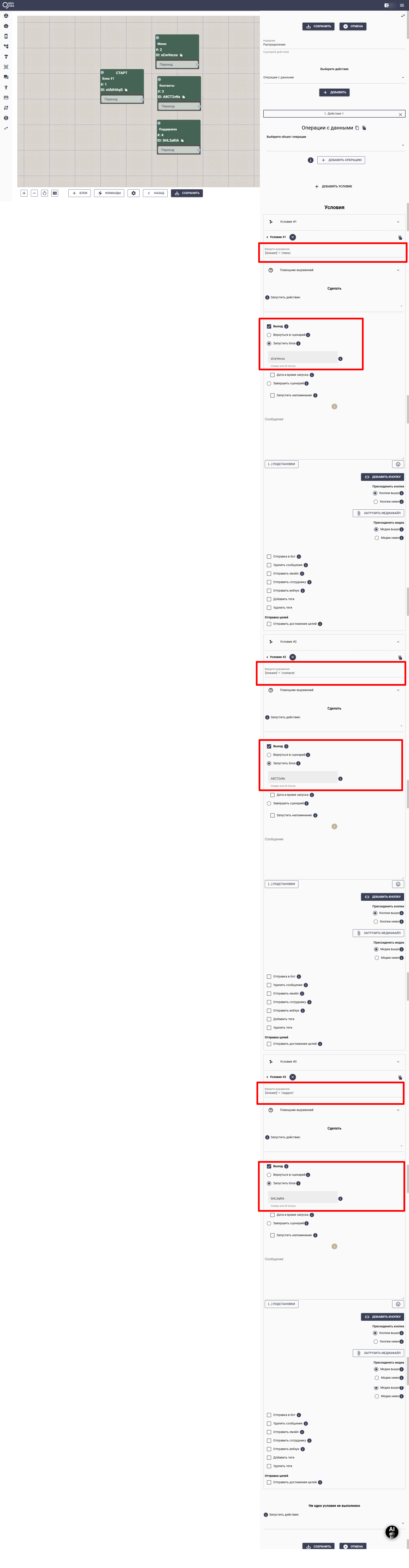После этого, в стартовом блоке, добавьте сценарий действий до запуска, а в нем условия обрабатывающие ответ блока. Например: '[Answer]' = '/command1' и выберите запуск нужного блока. В этом случае, после команды /command1 будет запущен указанный вами блок в одном сценарии.