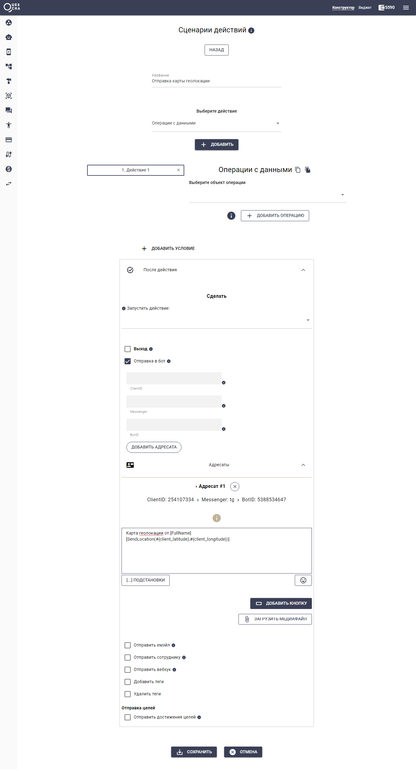 Если вы хотите отправить карту подписчику, вам потребуется указать координаты широты и долготы. Самый простой способ это зайти на Яндекс.Карты, найти нужную геопозицию и скопировать координаты, далее указать их в шаблоне [SendLocation(широта,долгота)]. Вставьте этот шаблон в сообщение для подписчика. Готово.