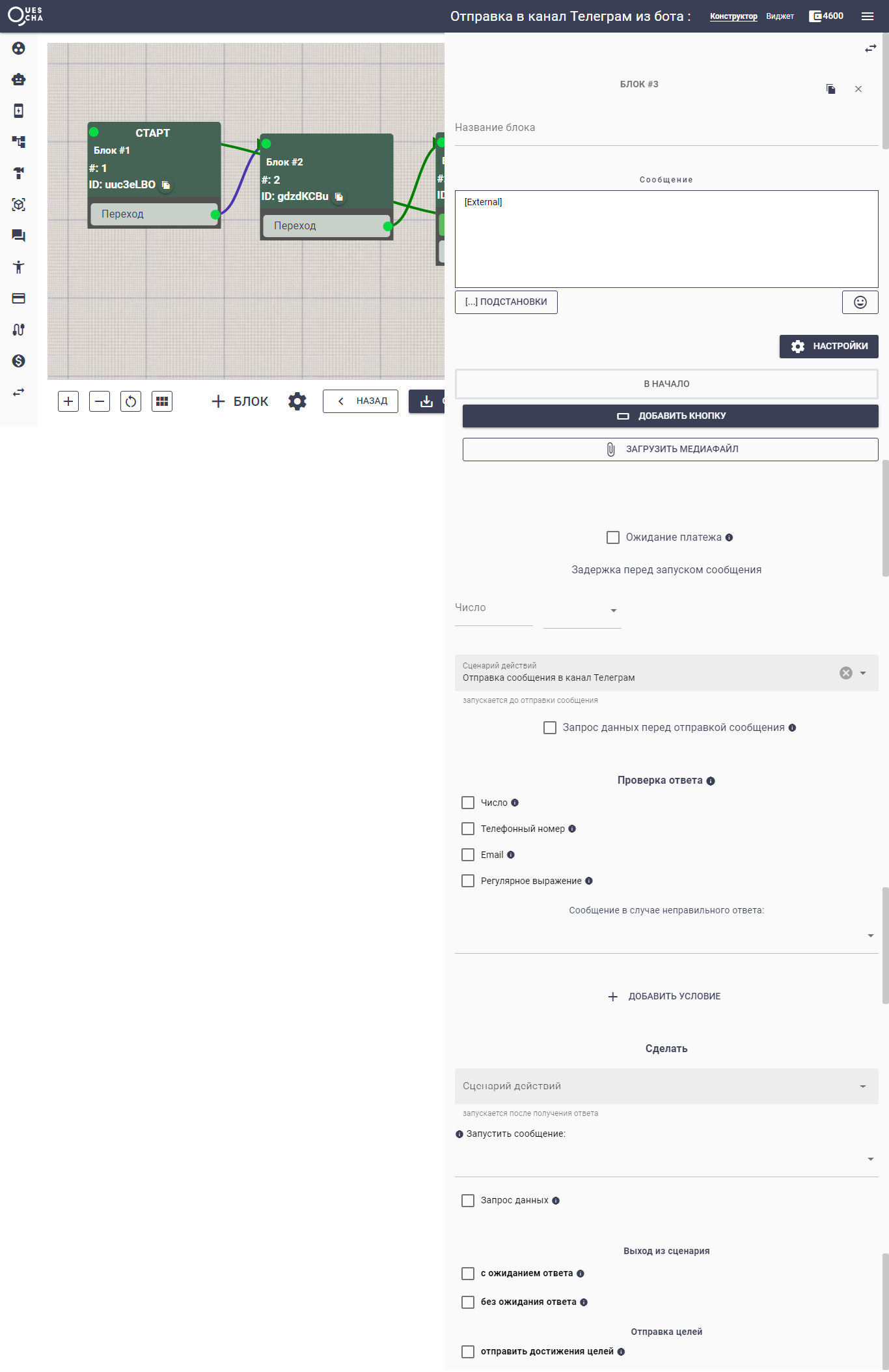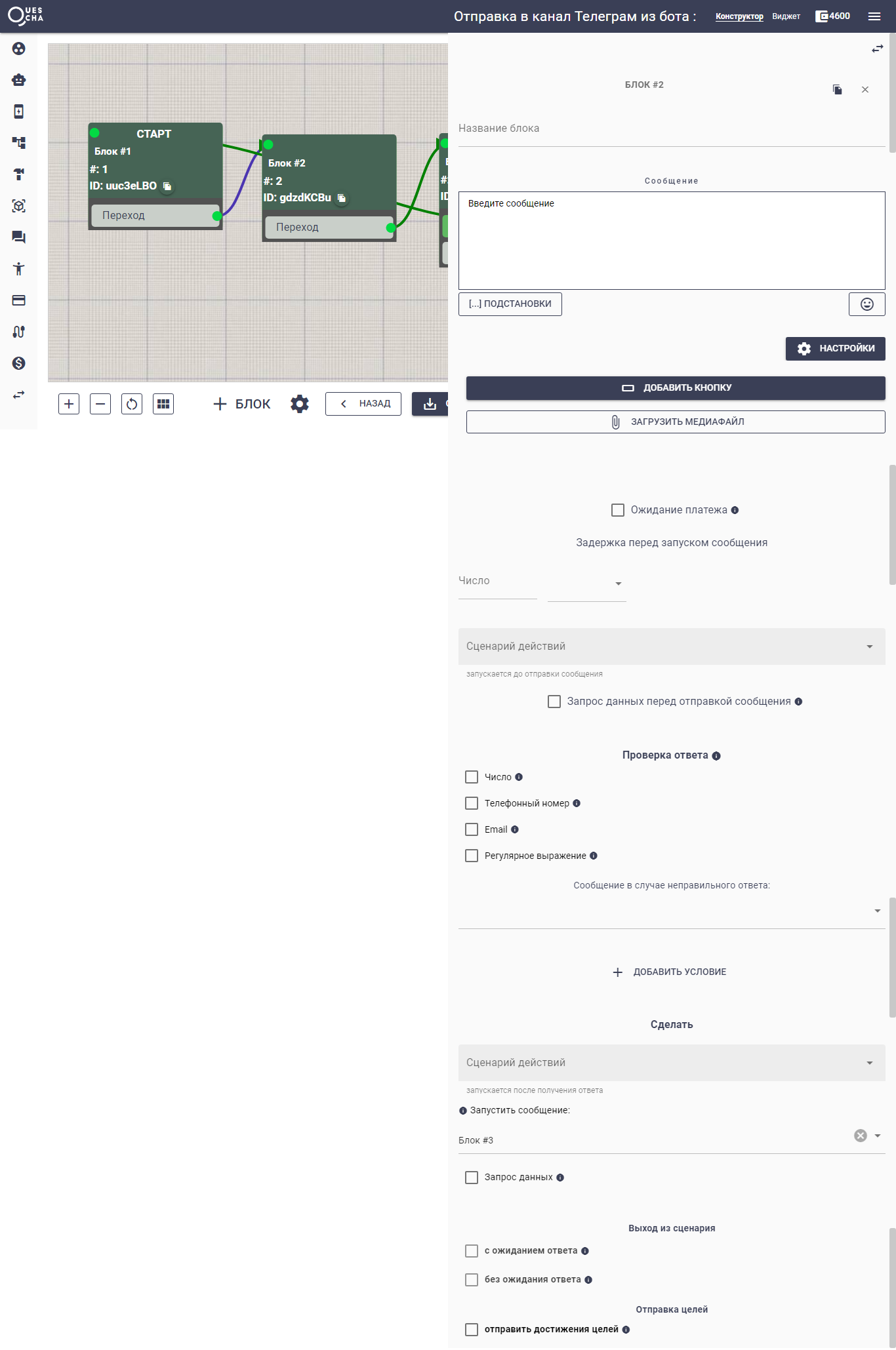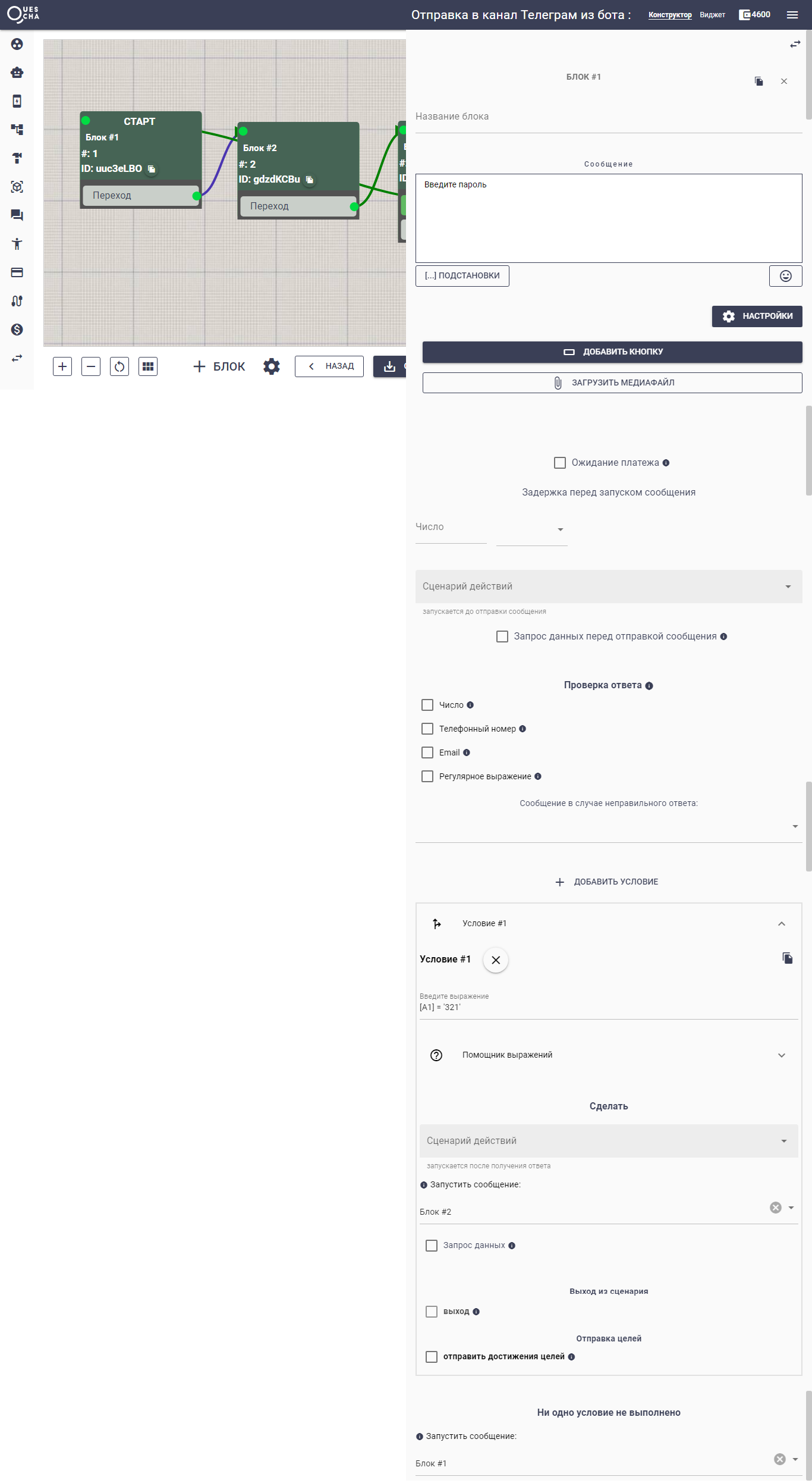 Создадим сценарий, где будем запрашивать пароль, проверять его и просить ввести сообщение. Далее отправляем сообщение на канал с помощью сценария действий. Всего 3 блока сообщений и 1 сценарий действий.