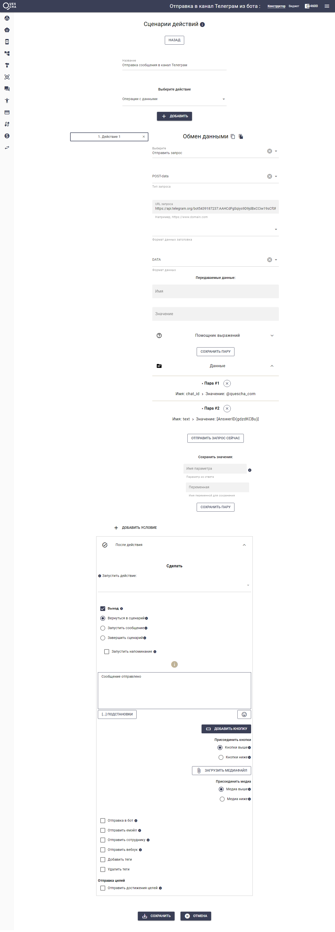 Отправлять сообщение в канал Телеграм мы будем используя API Телеграм напрямую. Сделаем это при помощи действия Обмен данными.