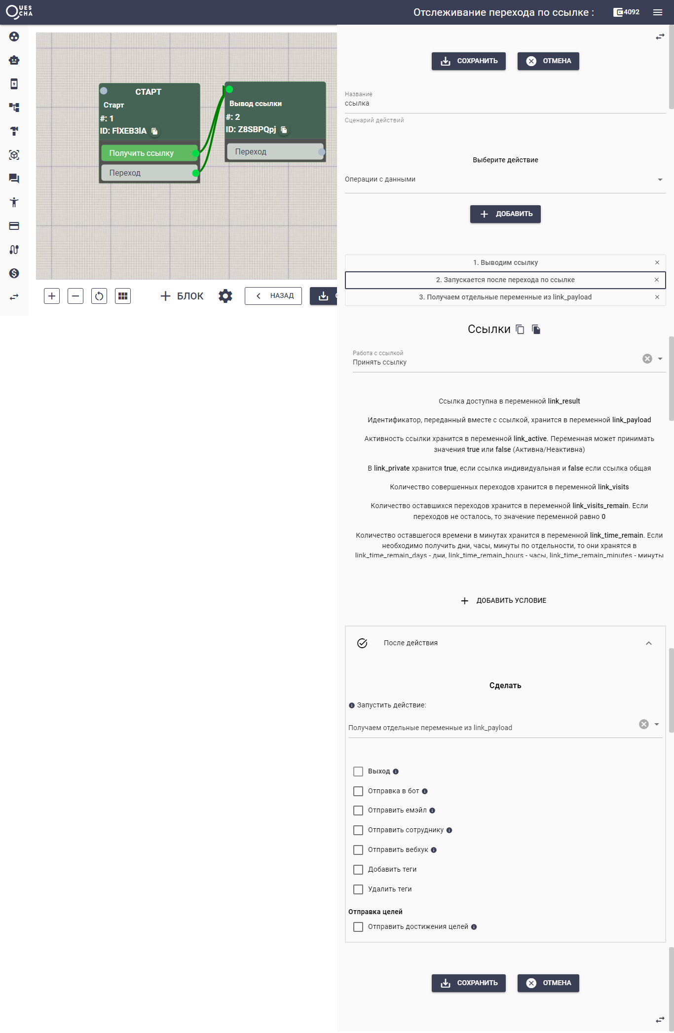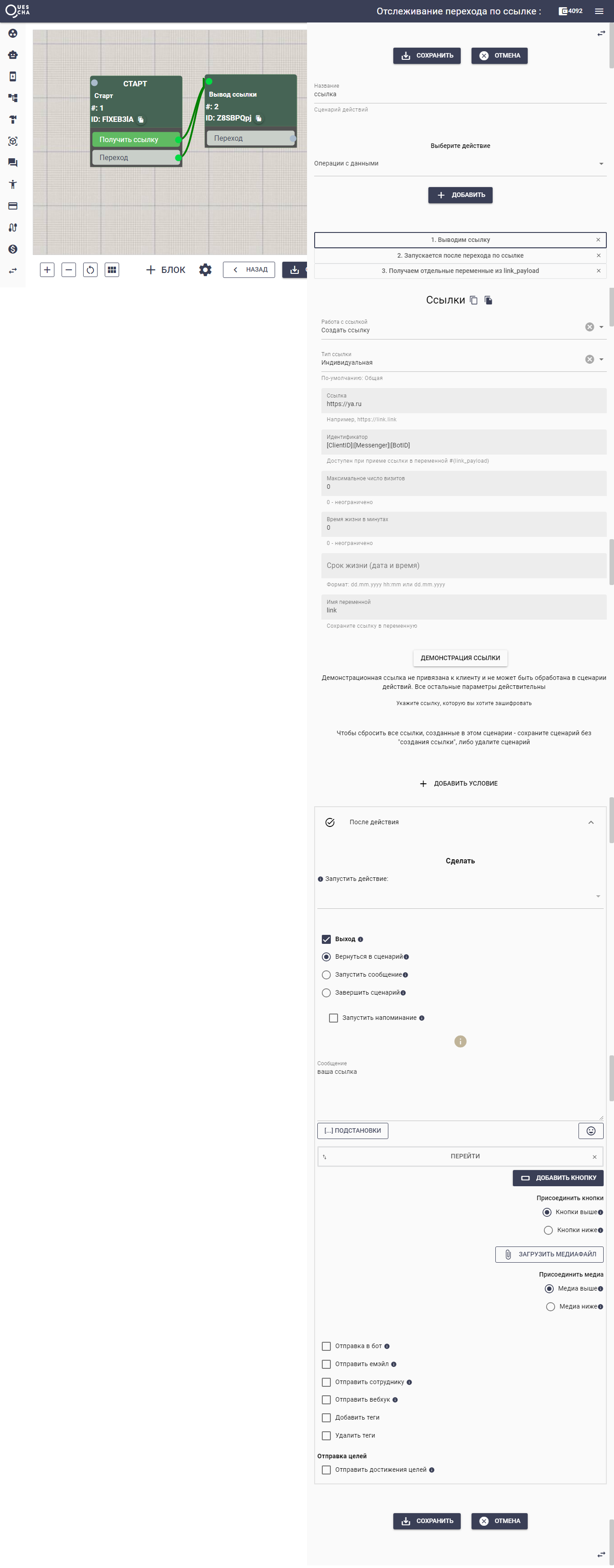 Для отслеживания перехода по ссылке мы будем использовать один сценарий действий, где сгенерируем ссылку и выведем ее подписчику, и также в этом сценарии будем отслеживать переход и отправлять сообщение в бот по переданным в ссылке данным.