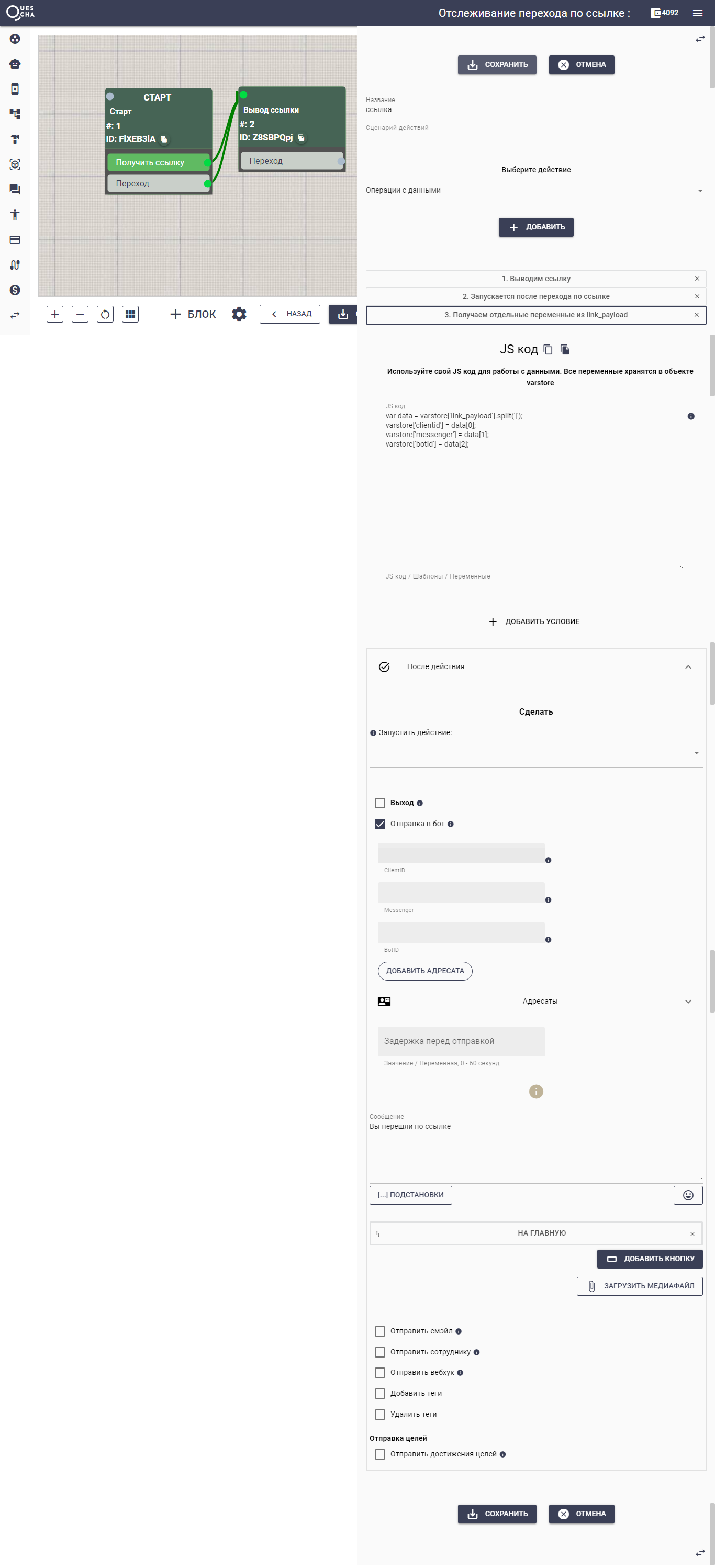 После него делаем переход на действие JS код, в котором мы преобразуем переданные параметры в ссылке в отдельные переменные clientid, messenger, botid. Ниже делаем отправку в бот по этим переменным в качестве адресата.