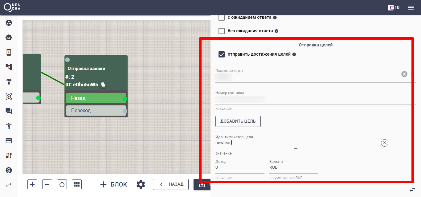 Далее можете отправлять свои цели в Яндекс.Метрику в блоках. Для этого, сначала создайте необходимые цели типа JavaScript-событие в своем счетчике Яндекс.Метрики.