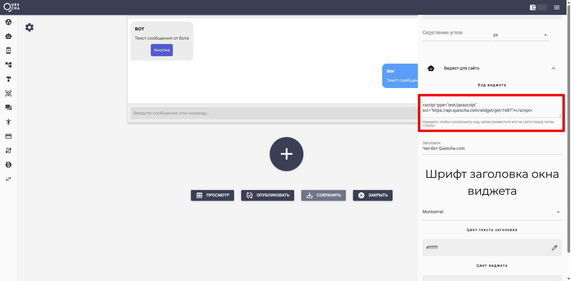 Виджет можно устанавливать на любой сайт. Для этого, после добавления блока "чат-бот", в его настройках в самом низу нужно скопировать код виджета и разместить на страницах сайта.