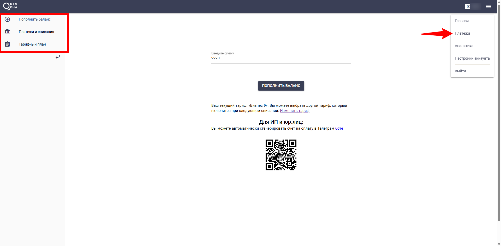Обзор интерфейсаПлатежиПлатежи На странице платежей доступно меню со страницами пополнения баланса, списка пополнений и списаний, страницы выбора тарифа. Перед первым пополнением убедитесь, что выбрали необходимый для работы бота тариф.