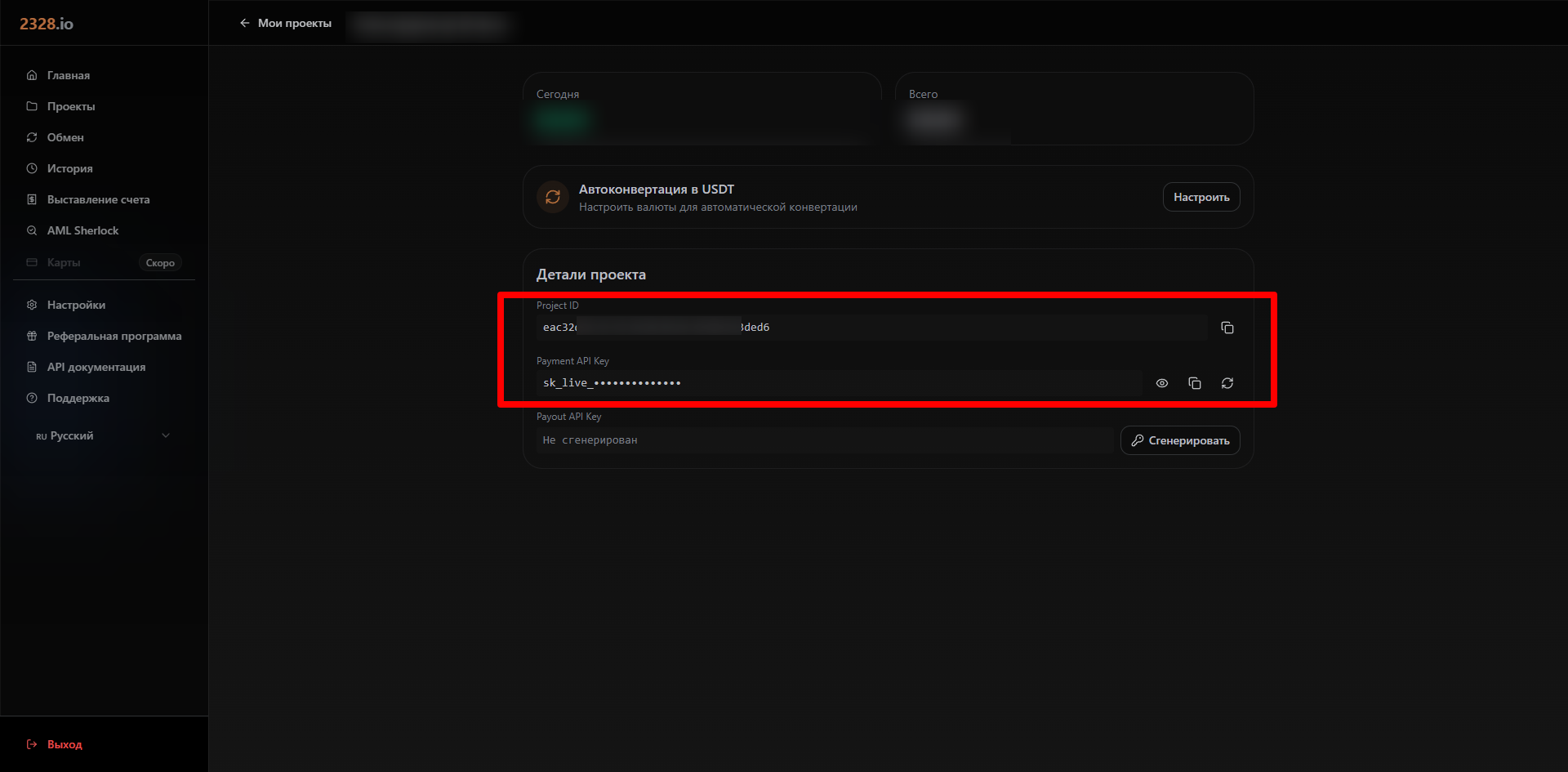 Чтобы подключить обработку платежей 2328.io вам потребуется Project ID и Payment API Key.