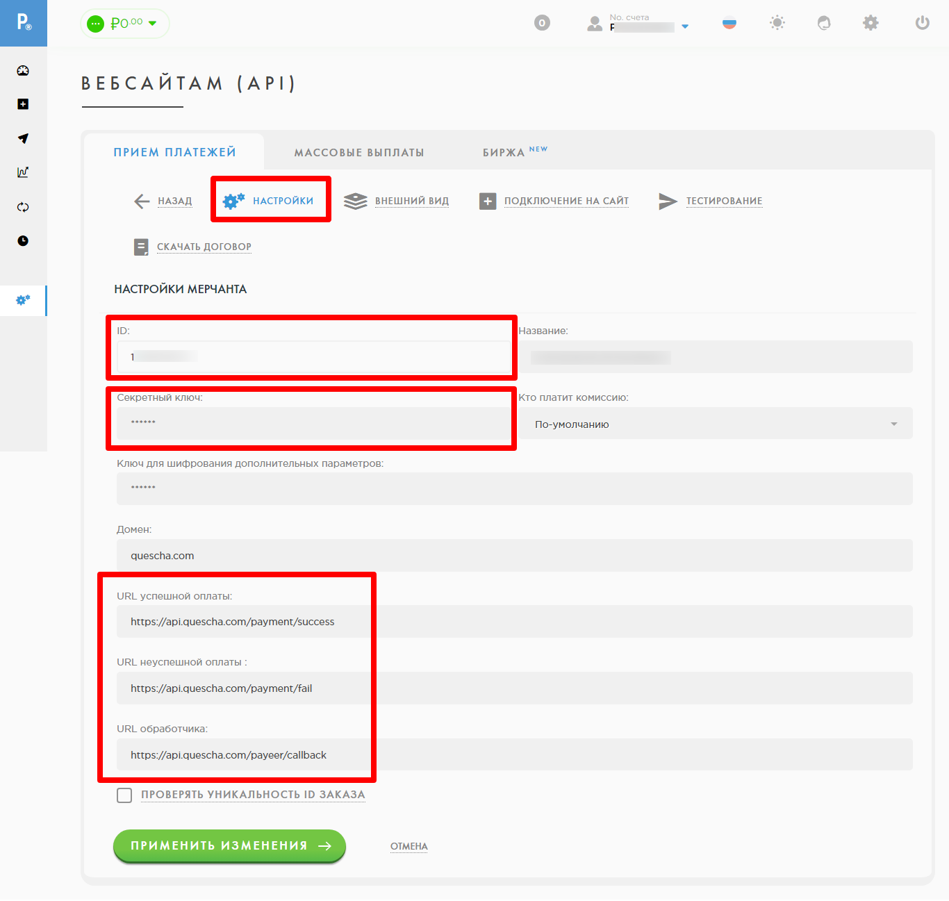 Для подключения платежной системы вам потребуются ID и Секретный ключ.
