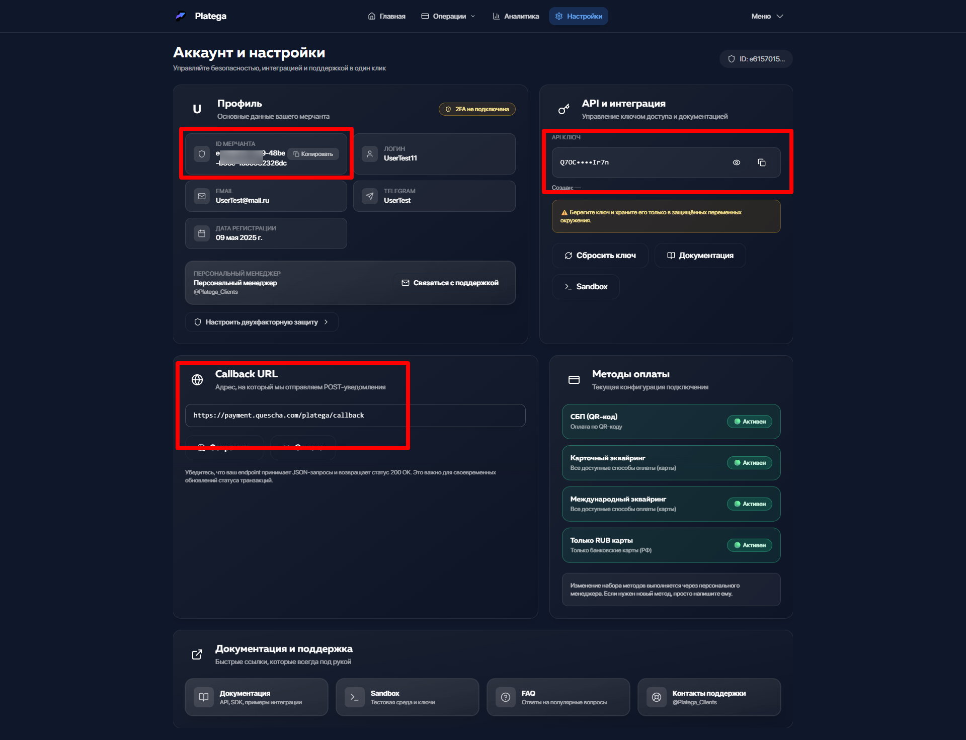 Чтобы подключить обработку платежей Platega вам потребуется ID Мерчанта и API ключ, а также необходимо установить адрес для уведомлений https://payment.quescha.com/platega/callback