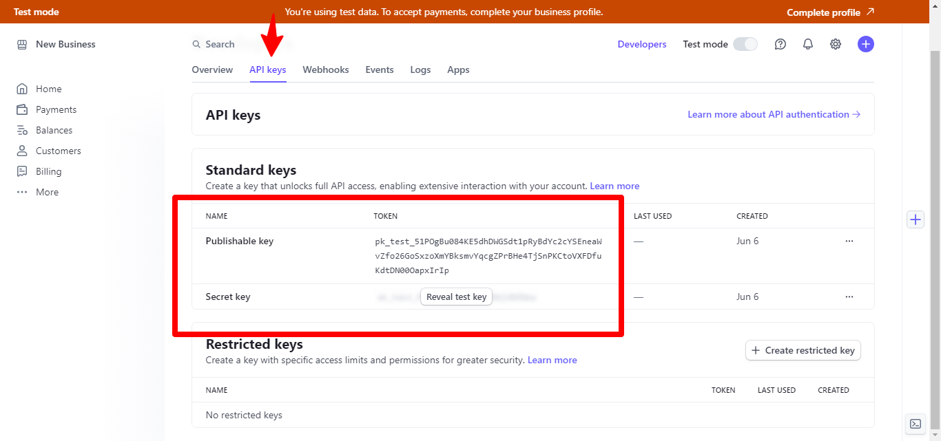 Для подключения платежной системы вам потребуются Publishable key и Secret key. Они находятся в аккаунте платежной системы.