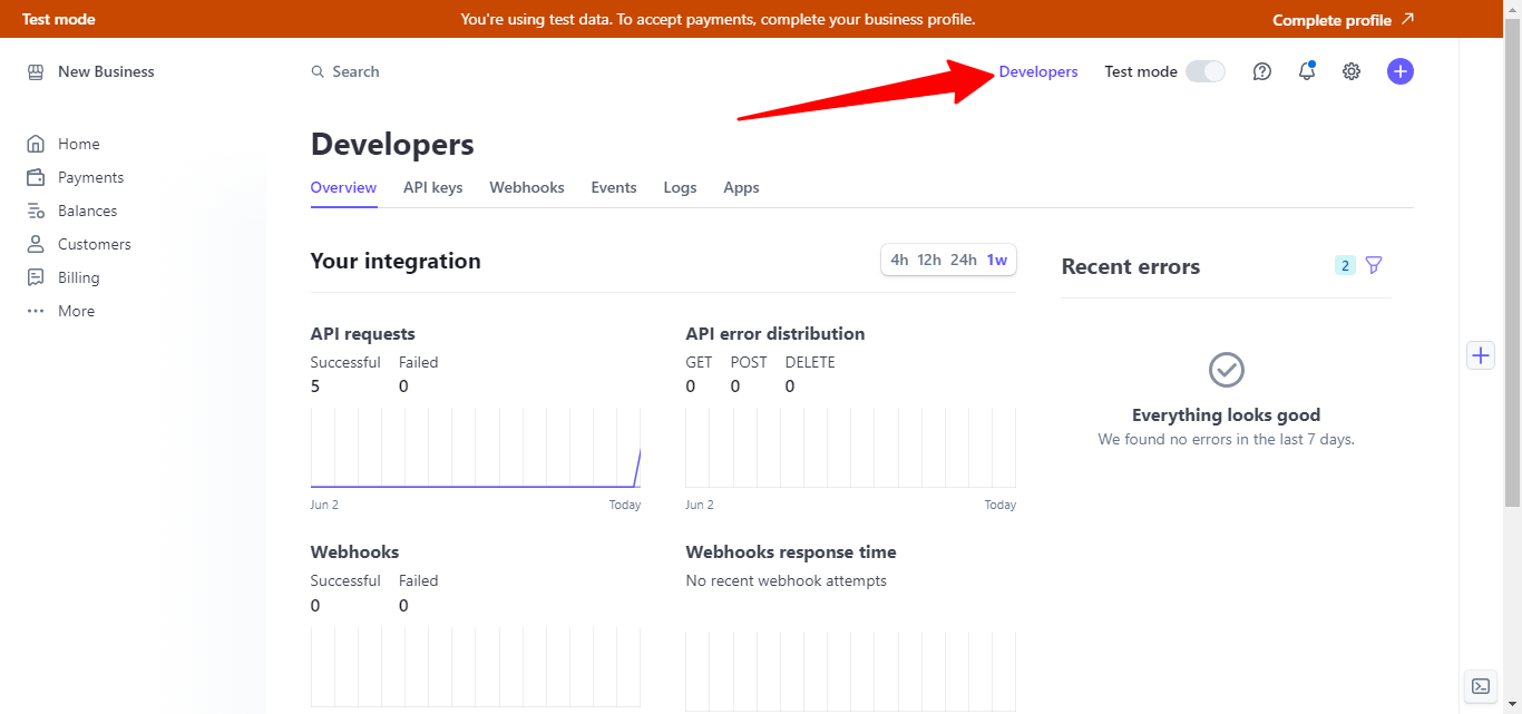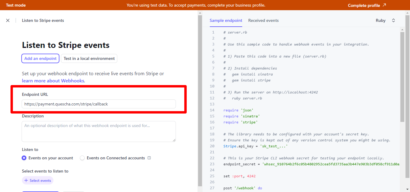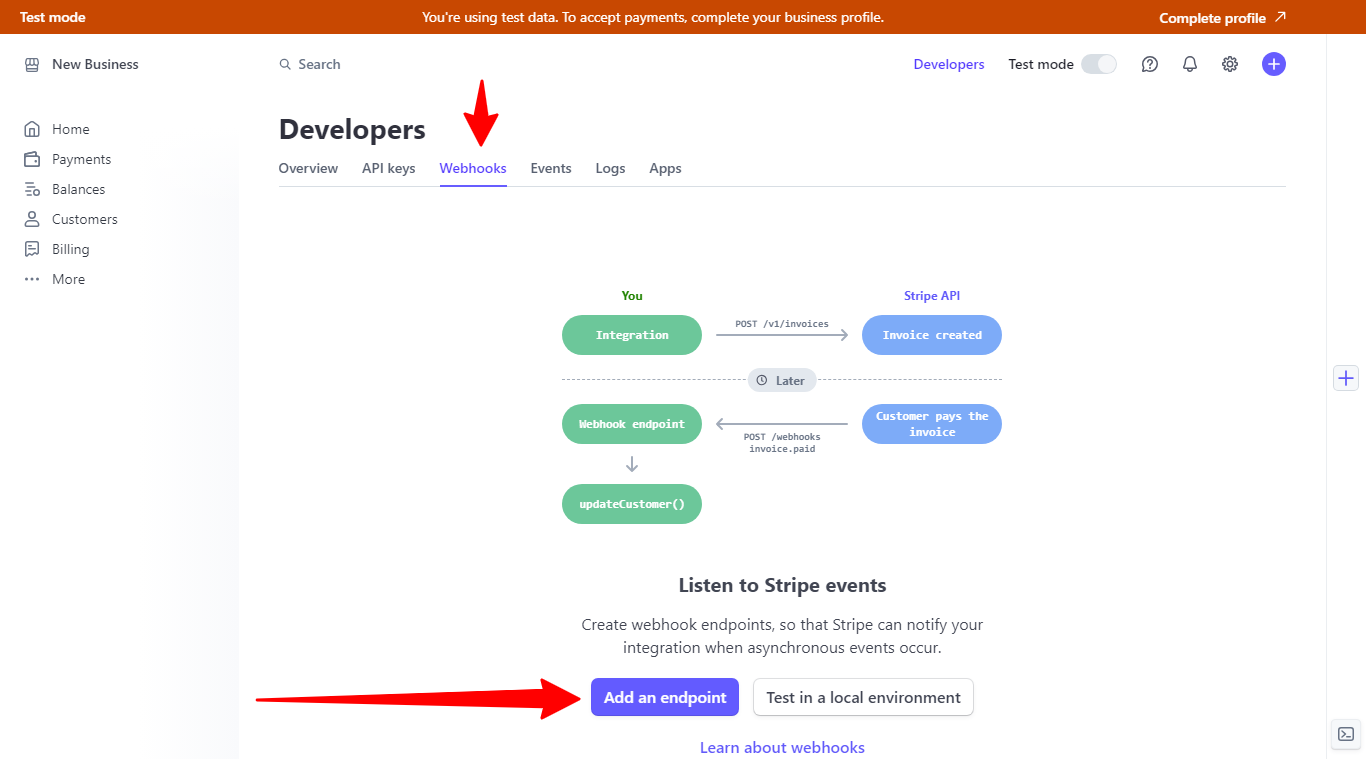 Скопируйте и вставьте URL для уведомлений и установите их в аккаунте Stripe. Для этого перейдите на страницу для разработчиков (Developers), нажмите на Add an endpoint на вкладке Webhooks.