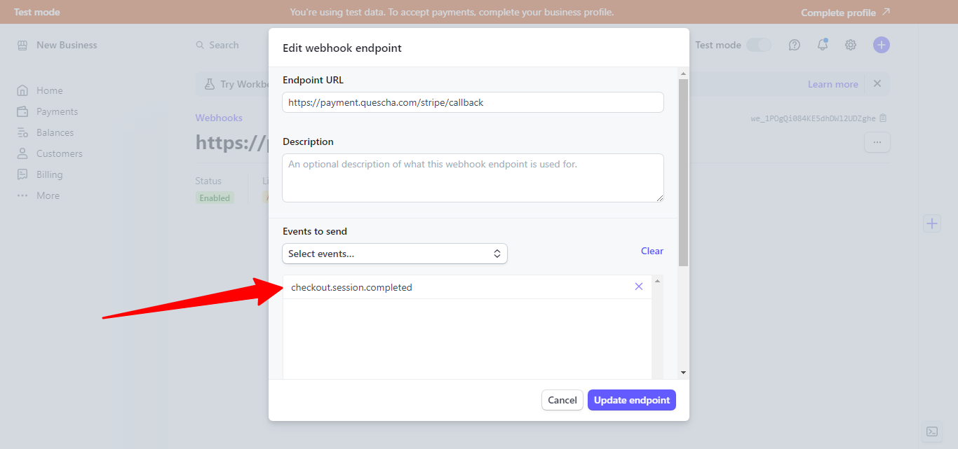 Выберите событие checkout.session.completed и сохраните настройки.
