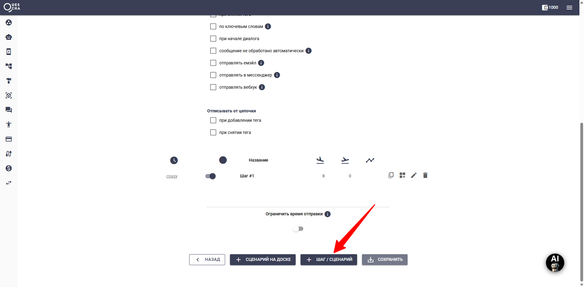 Чтобы добавить шаг цепочки, нажмите кнопку "+Шаг"